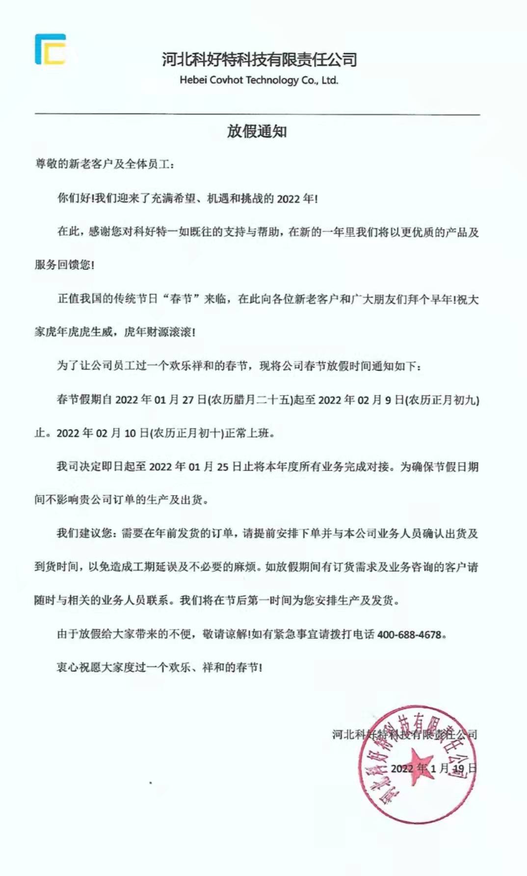 我司決定即日起至2022年01月23日止將本年度所有業(yè)務完成對接。為確保節(jié)假日期間不影響貴公司訂單的生產及出貨。