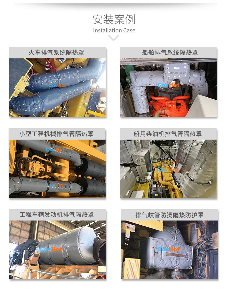 排氣管隔熱套主要用于船用柴油機(jī)排氣系統(tǒng)保溫隔熱、發(fā)電機(jī)配套動力系統(tǒng)排氣保溫隔熱、礦山車輛發(fā)動機(jī)排氣系統(tǒng)保溫隔熱等其他類型的車輛排氣系統(tǒng)保溫隔熱。