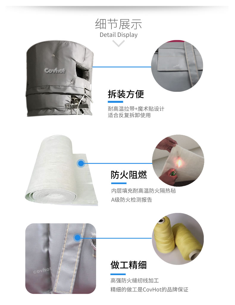 科好特covhot柔性可拆卸可拆卸擠出機保溫套按照用戶需要設計制作而成。安裝可拆卸保溫套后,可以讓設備表面溫度可降到40℃左右,觸摸不燙手。具有隔熱﹑防火防水、防油污、不腐化、耐腐蝕、表面可擦洗、強度大、易彎曲,深受廣大擠出機設備用戶喜愛。