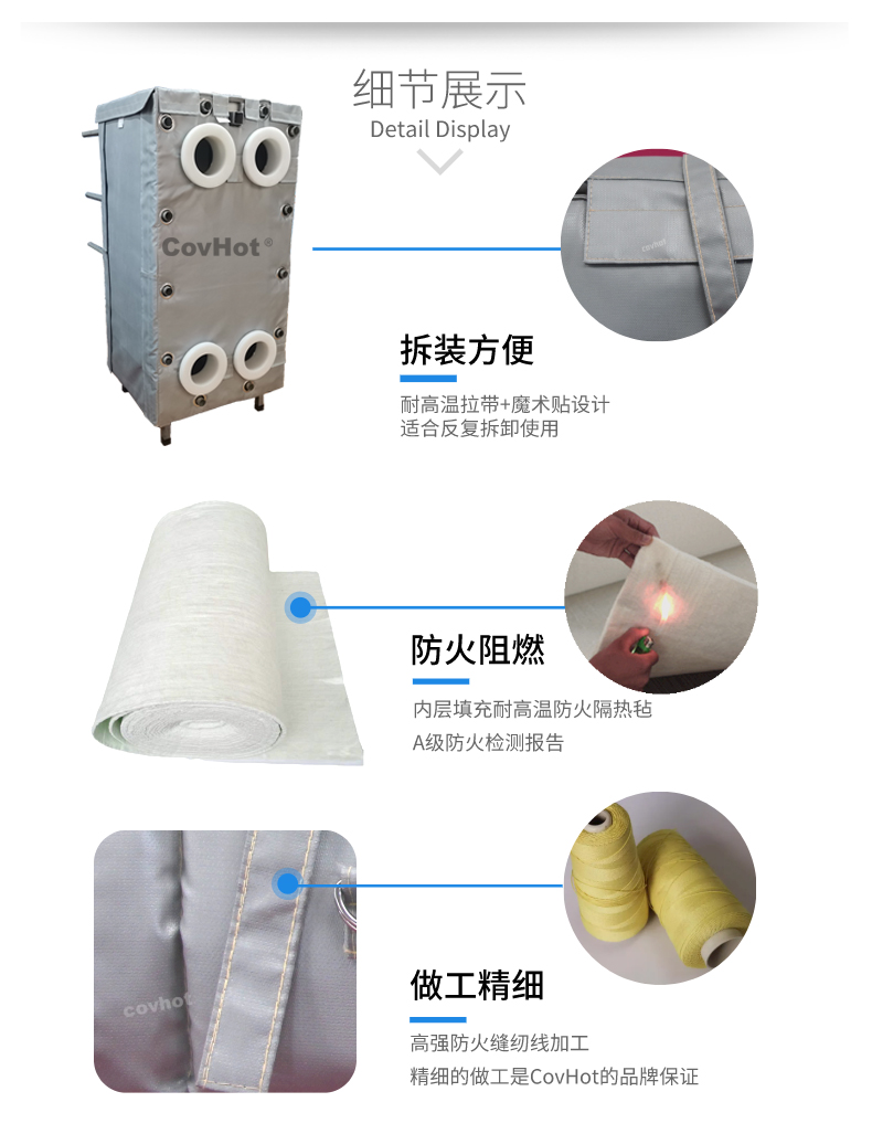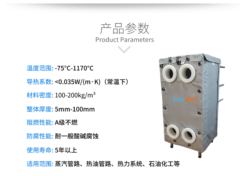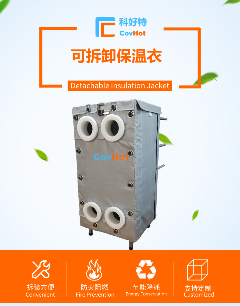 針對(duì)以上的問(wèn)題,河北科好特科技有限責(zé)任公司自主研發(fā)的節(jié)能型板換保溫衣,可以有效減少換熱器的熱量損耗,而且在施工過(guò)程中安裝拆卸方便,節(jié)省人工,可拆卸保溫衣還可重復(fù)使用,起到節(jié)能降耗的效果。科好特可拆卸保溫衣根據(jù)設(shè)備不同的尺寸形狀量身定制,可廣泛用于換熱器、閥門、管道及其它需要保溫或防凍的領(lǐng)域。